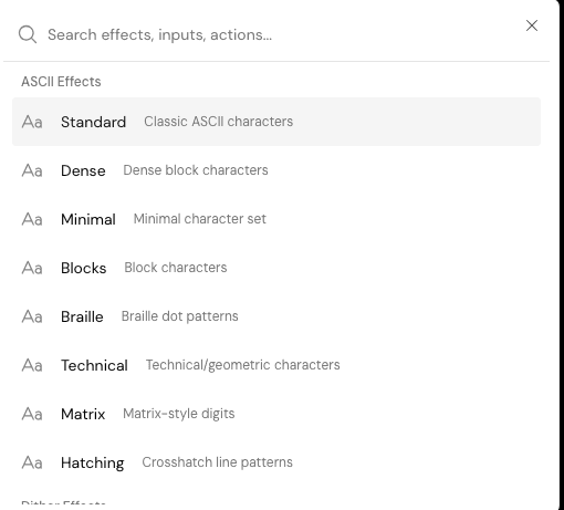 - Complete effect documentation - every ASCII, dither, halftone, glitch, and art effect with parametersfeature